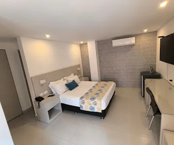 The double room is ideal for couples or travelers seeking comfort and relaxation. It features a queen-size bed (160 x 190 cm), a private bathroom, air conditioning, cable TV, a minibar, a work desk, and a safe, offering all the necessary amenities for a comfortable stay. The room is 100% non-smoking, guaranteeing a clean and pleasant environment.